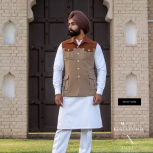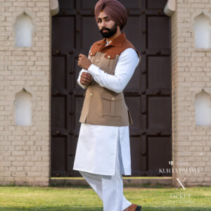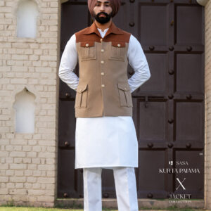 This sophisticated ethnic ensemble features a dual-tone jacket in refined beige and rich rust hues, paired seamlessly with a classic white kurta pajama. Crafted from premium fabric, the jacket showcases a structured silhouette with detailed pocket styling and a polished finish that adds modern character. Complementing it perfectly, the white kurta pajama is tailored from luxurious cotton fabric, offering exceptional breathability, comfort, and effortless elegance. Ideal for festive occasions, weddings, and cultural celebrations, this ensemble blends contemporary design with traditional charm, delivering a timeless look for men who appreciate versatility, craftsmanship, and refined ethnic styling.