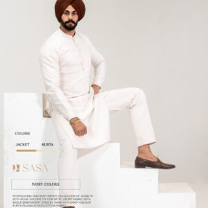 This elegant ethnic ensemble features a beige golden jacket paired seamlessly with an ivory kurta pajama, creating a refined and timeless combination. Crafted from luxury fabric, the jacket is highlighted with exquisite hand-embroidered eagle motifs that add a bold yet regal character. The ivory kurta pajama, tailored from rich cotton fabric, offers superior comfort, breathability, and a graceful silhouette. Ideal for festive celebrations, cultural gatherings, and special occasions, this ensemble blends traditional artistry with modern sophistication, delivering a powerful statement of elegance and confidence for men who appreciate detailed craftsmanship and classic ethnic style.
