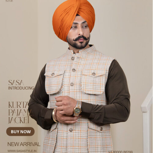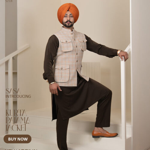 A beige plaid jacket with subtle orange lines offers a refined balance of class and modern sophistication. The soft beige base brings timeless elegance, while the delicate orange accents add a fresh contemporary touch without overpowering the design. Tailored with premium fabric and a sharp, structured fit, this jacket ensures comfort along with a polished appearance. Perfect for weddings, receptions, festive gatherings, office parties, and Indo-western styling, it complements beige, white, rust, brown, and earthy kurta pajamas or trousers effortlessly. Ideal for men who appreciate understated fashion, this plaid jacket stands out with its clean pattern, stylish detailing, and subtle luxury appeal.