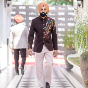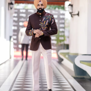 Brown Embroidered 2 Piece Band Gala Coat Pant