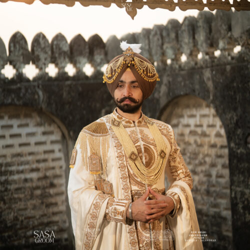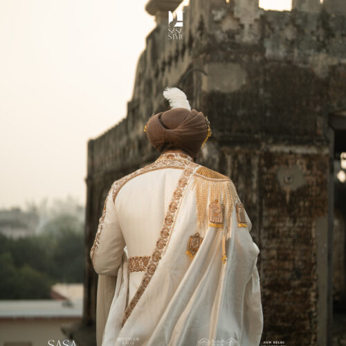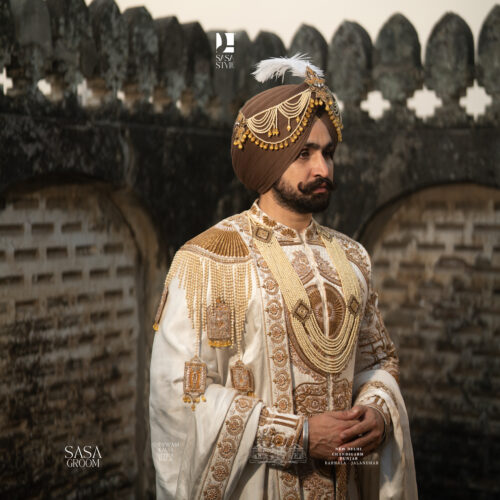 Step into royalty with this exquisite cream-gold sherwani, crafted for the modern groom who values tradition with grandeur. Featuring intricate architectural embroidery and majestic royal horse motifs, this masterpiece reflects timeless elegance and noble charm. The rich detailing adds depth and character, making it perfect for weddings, receptions, and regal celebrations. Paired with a statement royal mala and an elegant palla, this ensemble creates a complete Maharaja-inspired look. Designed to command attention, it delivers a powerful presence while maintaining refined sophistication. A true symbol of heritage, luxury, and royal masculinity.