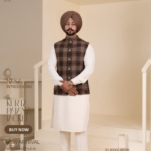 A dark brown jacket with beige plaid checks brings a refined blend of bold elegance and subtle sophistication to ethnic and Indo-western fashion. The deep brown base adds a classic, powerful presence, while the beige plaid pattern introduces a soft contrast that enhances visual charm without overwhelming the look. Tailored with premium fabric and a structured fit, this jacket provides superior comfort and a polished silhouette ideal for weddings, festive occasions, receptions, and formal gatherings. It pairs beautifully with beige, white, off-white, cream, or earthy kurta pajamas and formal trousers. Perfect for men who prefer classy, timeless fashion, this jacket reflects confident style with understated luxury.