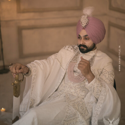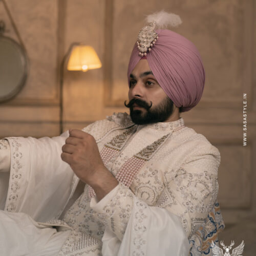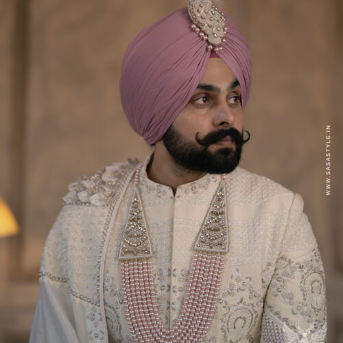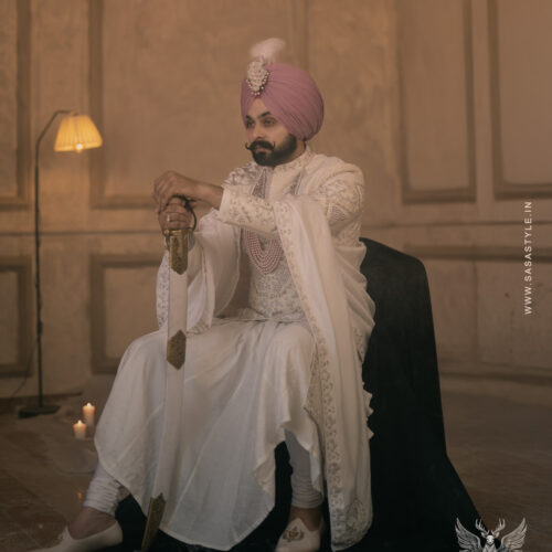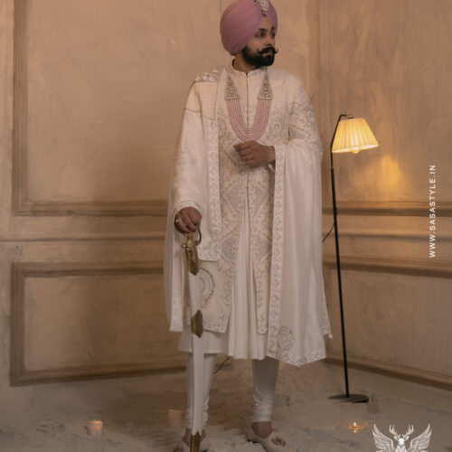 SASA Style presents an exquisite white sherwani, designed for grooms who desire a look of timeless elegance. Crafted with intricate hand embroidery and royal detailing, this sherwani beautifully blends classic charm with contemporary luxury. Its meticulous craftsmanship ensures a regal presence, making it ideal for grand weddings, receptions, and special occasions. The subtle yet sophisticated design enhances the groom’s persona, creating a memorable statement on his big day. Perfectly tailored for comfort and style, this elegant white sherwani embodies refinement, grace, and modern sophistication, setting a benchmark for premium wedding attire.
