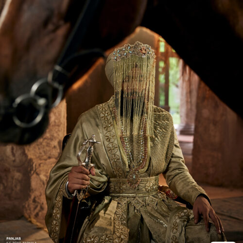 This lemon green and pink sehra captures the essence of celebration with its vibrant hues and intricate craftsmanship. The soft pink detailing blends harmoniously with the bright lemon green, creating a royal, eye-catching accessory for the groom. Designed to enhance tradition, it adds elegance and grandeur to the wedding look.