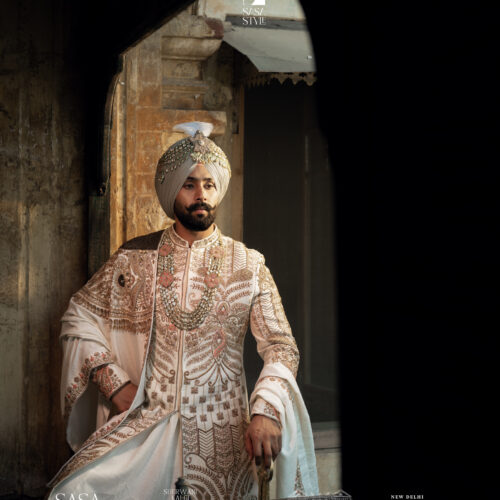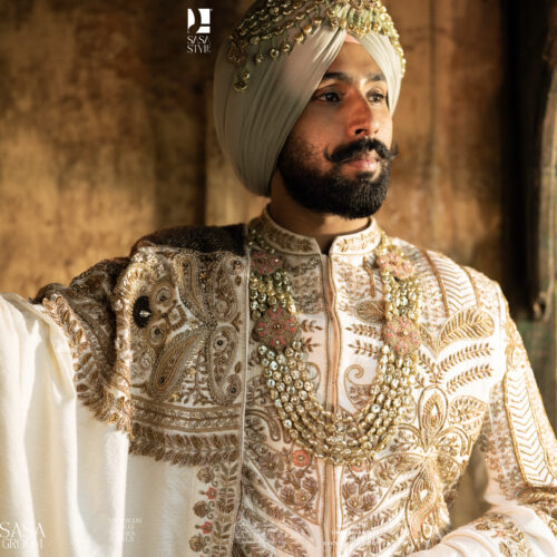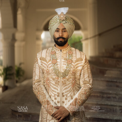 Magnificent Cream Sherwani with Gold-Copper Embroidery & Royal Turban - SASA Style