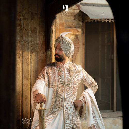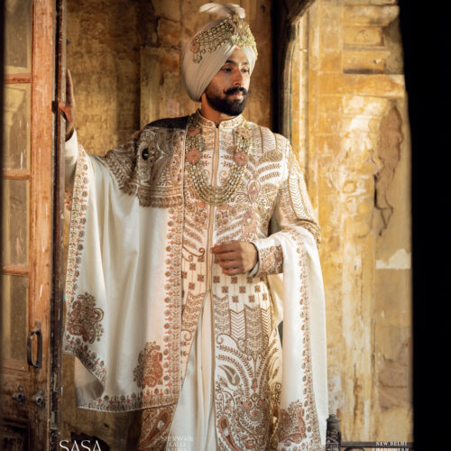 Step into timeless royalty with this magnificent cream sherwani, crafted to reflect the grandeur of a true Maharaja. Designed with intricate gold and copper hand embroidery, every detail showcases exceptional craftsmanship and regal elegance. The luxurious silhouette is paired with a statement turban, beautifully adorned with jewels and a majestic plume, completing the royal aura. Perfect for weddings, receptions, and special celebrations, this sherwani blends traditional heritage with modern sophistication. The rich texture, fine finishing, and graceful appeal make it an unforgettable outfit for the groom who wants to stand out with power, charm, and class.