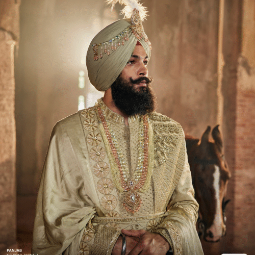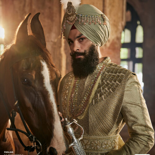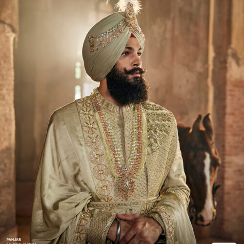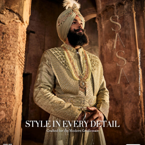 Experience grandeur with SASA STYLE’s exquisite Pushaq Pajami Palla, crafted in a subtle greenish-olive base enriched by a luxurious gold metallic sheen. This royal masterpiece beautifully blends traditional craftsmanship with modern sophistication, making it an exceptional choice for grooms who wish to exude regal charm and confidence. Every intricate detail reflects heritage artistry and opulent design, offering a perfect balance of tradition and contemporary elegance. Ideal for weddings, royal events, and festive occasions, this ensemble transforms every moment into a statement of style, luxury, and timeless magnificence.