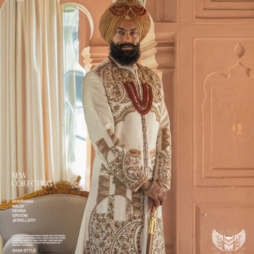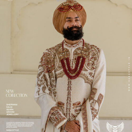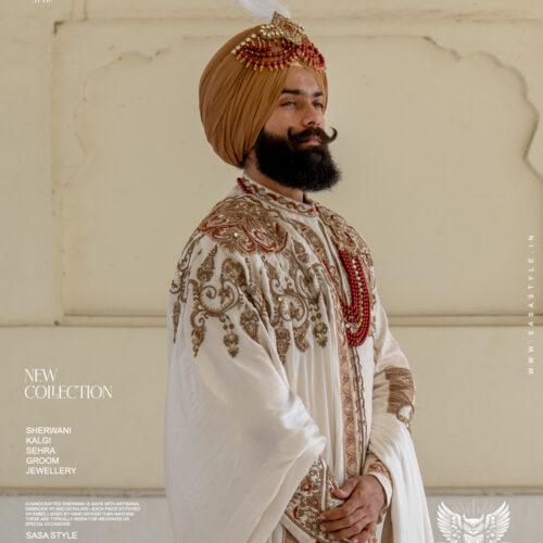 A stunning rust and golden kalgi crafted to elevate groom’s regal look. The rich rust base symbolizes strength and tradition, while the golden detailing adds a touch of royal elegance. Intricately designed with fine handwork, shimmering stones, and delicate motifs, this kalgi blends heritage with modern sophistication. Perfect for turbans in shades of cream, maroon, rust, or gold, it enhances the overall wedding attire with unmatched charm. Ideal for grooms who want a bold yet graceful accessory that stands out beautifully in photos and ceremonies. A timeless piece that completes the majestic wedding ensemble.